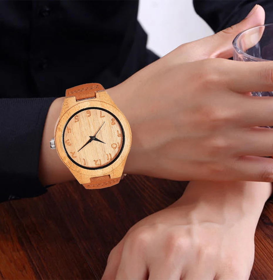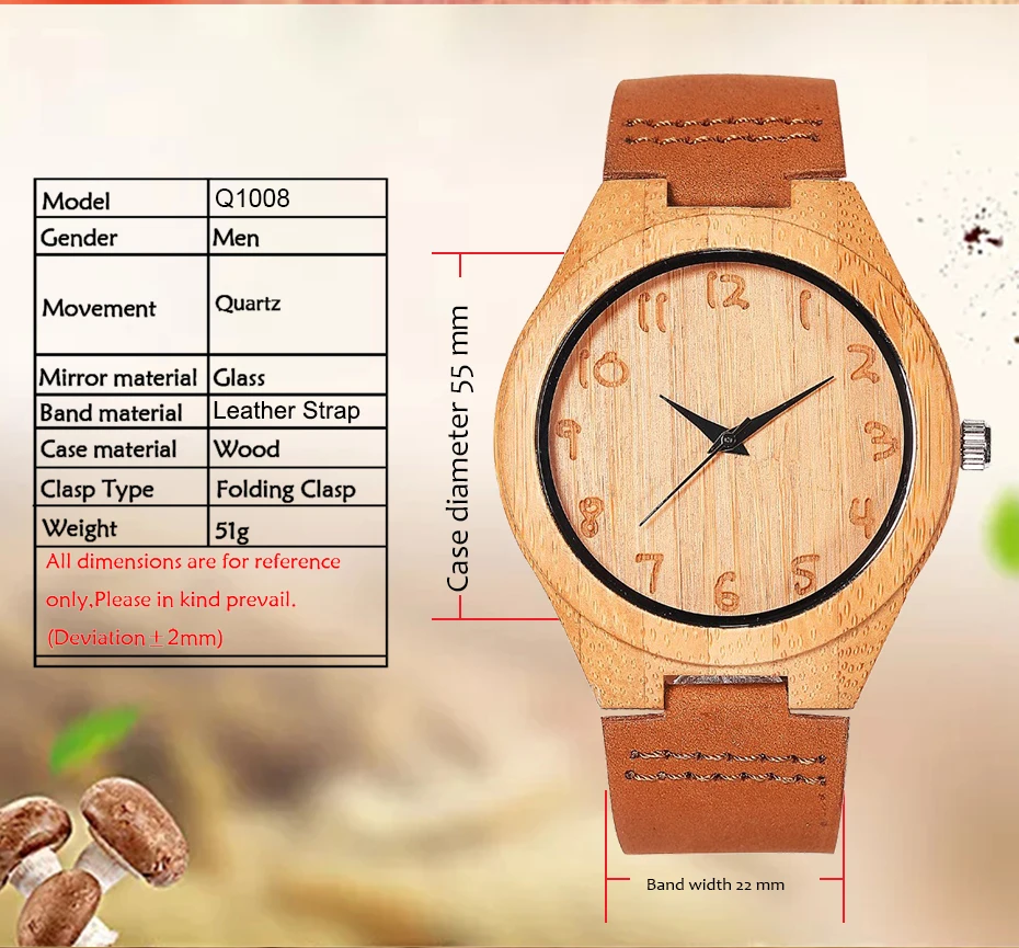 Made of 100% natural wood,there may be some spots on the watch, It is not the quality problem.And also maybe the natural colors of them are slightly different from each other and color difference.
