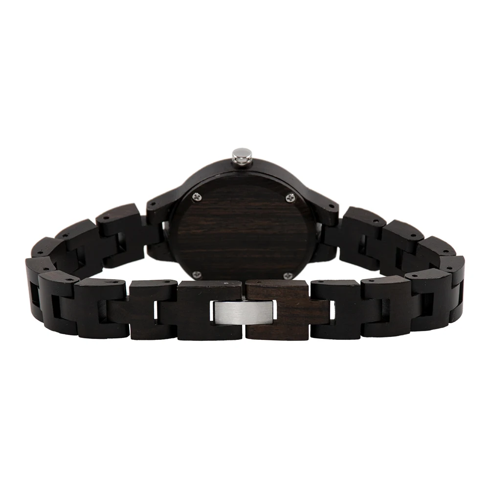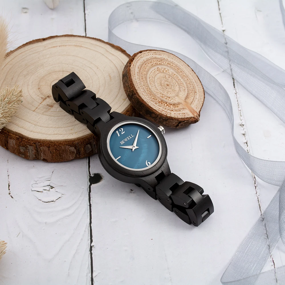 The round case and wooden band combine to create an elegant and stylish timepiece for women.